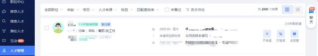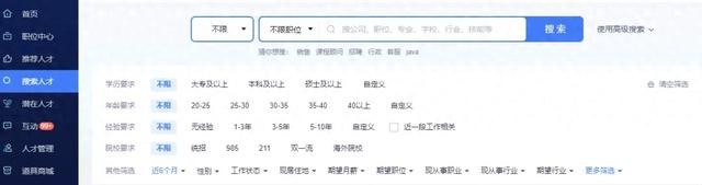 筛选页面:不管是HR主动搜索的简历还是人选主动投递的简历,为提升效率,HR一般都会设置硬性筛选条件,比如学历、年龄、工作年限、所处行业、岗位等,排除了大部分不合适简历,这些简历完全不会进入到HR视野(下图为智联招聘简历搜索页面,其他各大招聘平台页面相差不大);